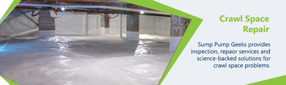 The Sump Pump Geeks are the professionals you need to address your crawl space problems. They are trained and certified to inspect it, repair any issues that arise in a professional manner, install an effective vapor barrier for protection against moisture intrusion!